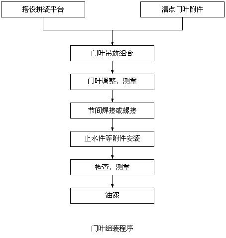 要求組裝前,在廠內(nèi)或在門槽附近搭設(shè)拼裝平臺,平臺用型鋼或混凝土鋪設(shè)。搭設(shè)平臺時應(yīng)考慮留出焊接、安裝附件和進(jìn)行檢查測量的位置。